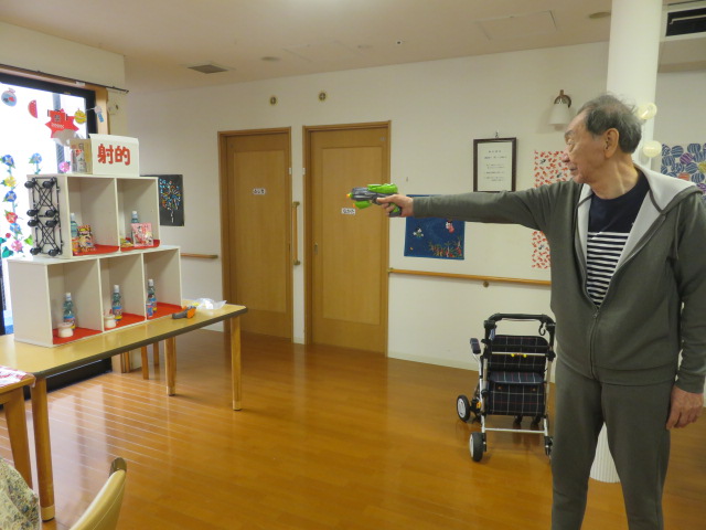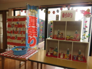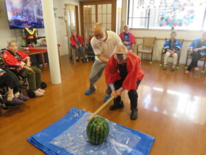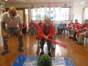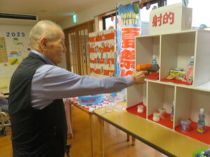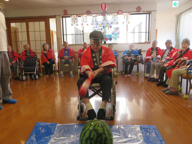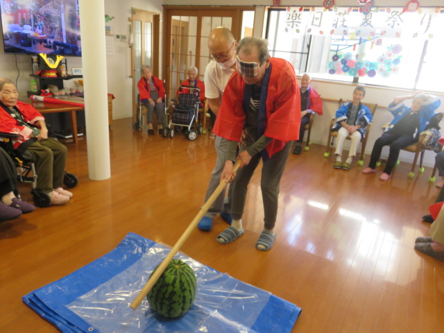 夏祭り(陽ユニット) 2025年8月29日 楽日荘スタッフ 1F 陽 8月28日 今年も「楽日荘夏なつり」を行いました。 合同でスイカ割り大会!!とっても盛り上がりました!! 陽ユニットでは、 射的、ヨーヨーすくい、スーパーボールすくい、わたあめ チョコバナナなど楽しみました!!