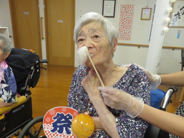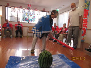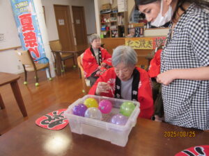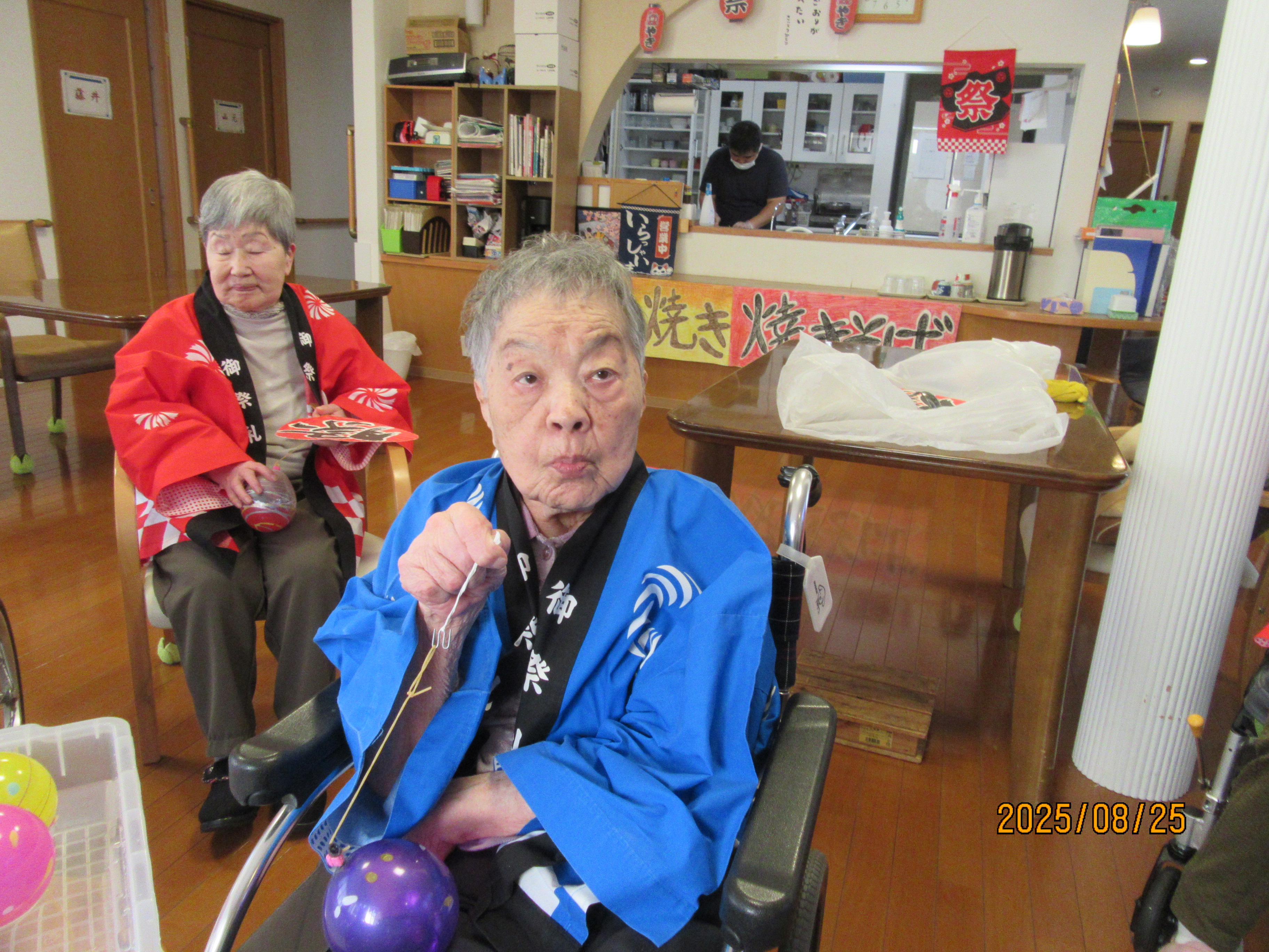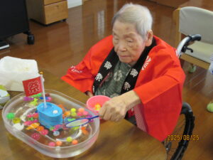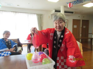 夏祭り part③ (2F 風ユニット) 2025年9月12日 楽日荘スタッフ 2F 風 金魚すくいやボールすくいにスイカ割りと とても楽しんでおられました(≧▽≦) かき氷も美味しく頂きました。 アキ🦎