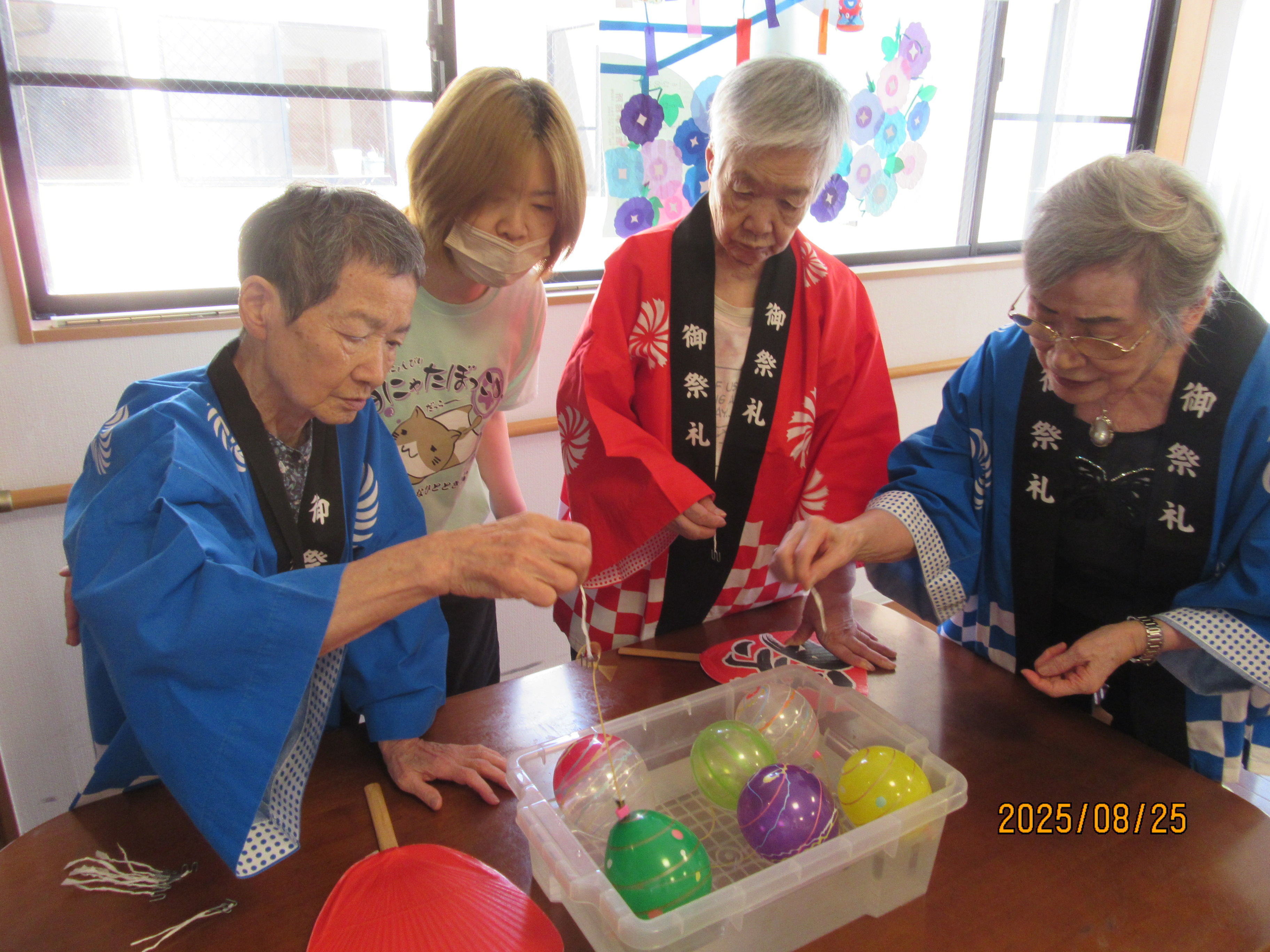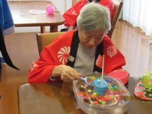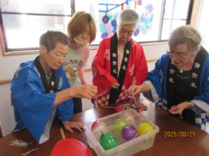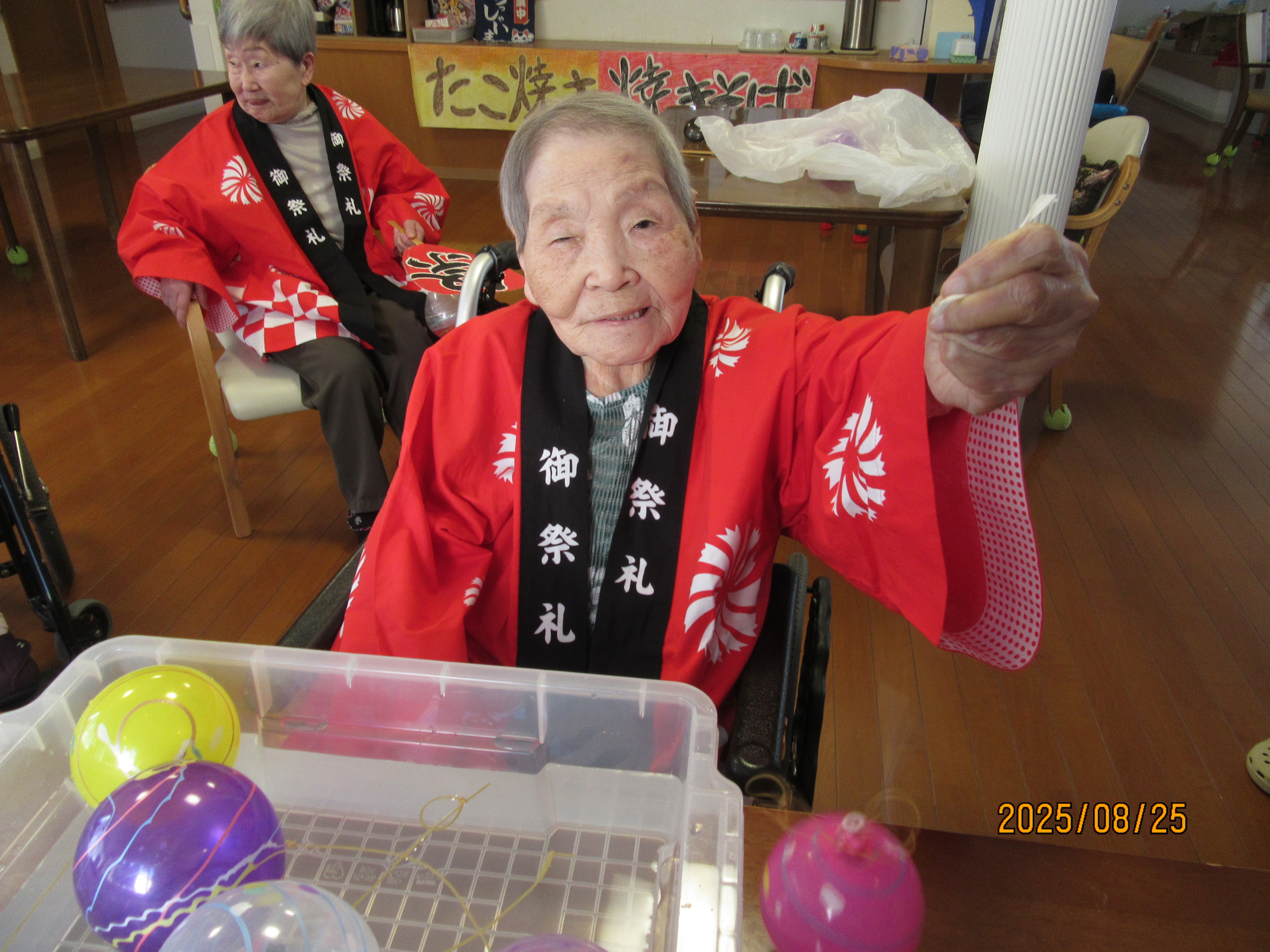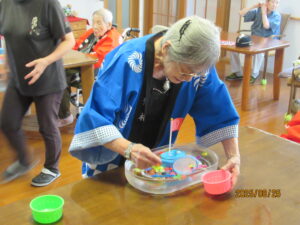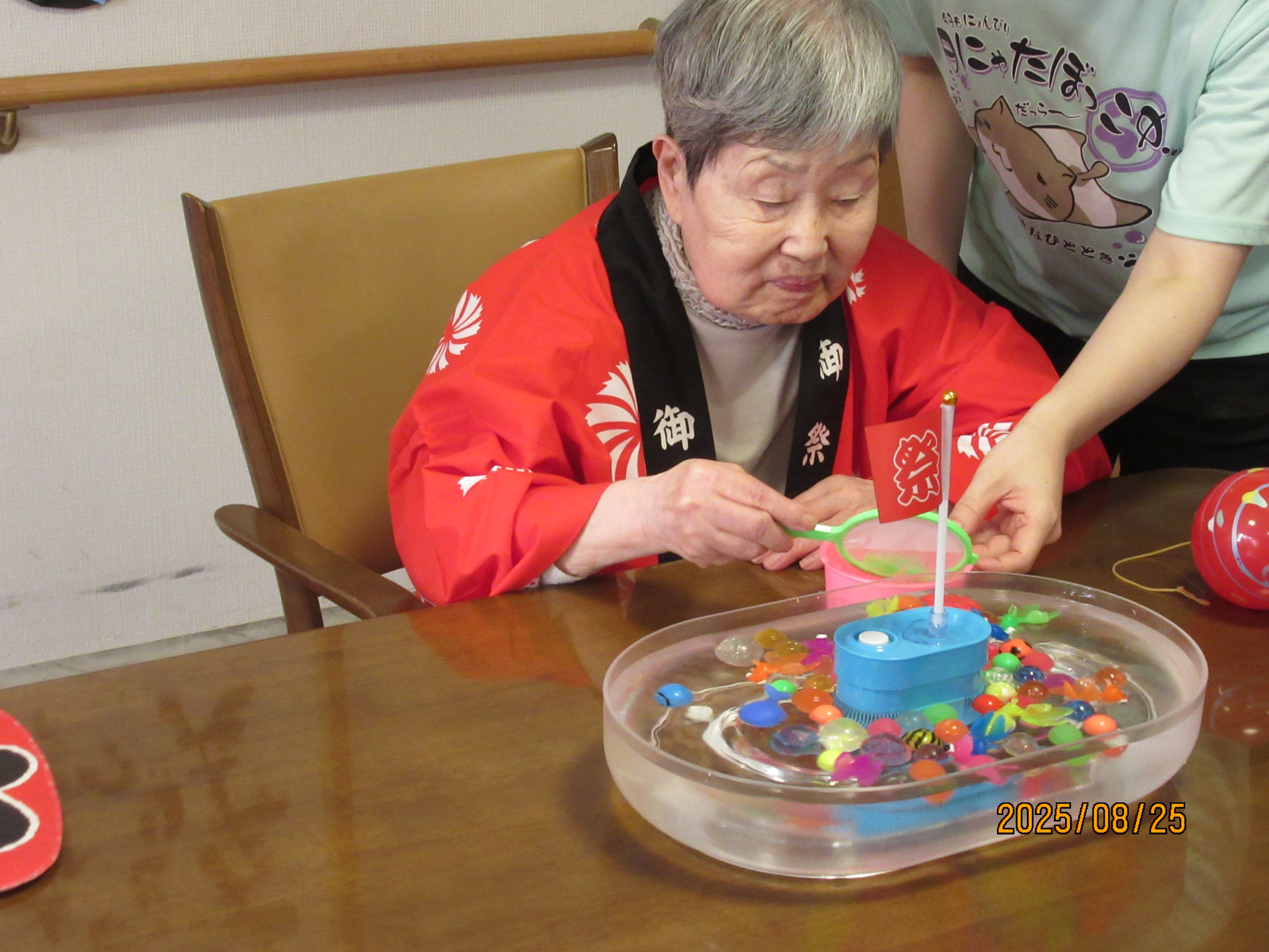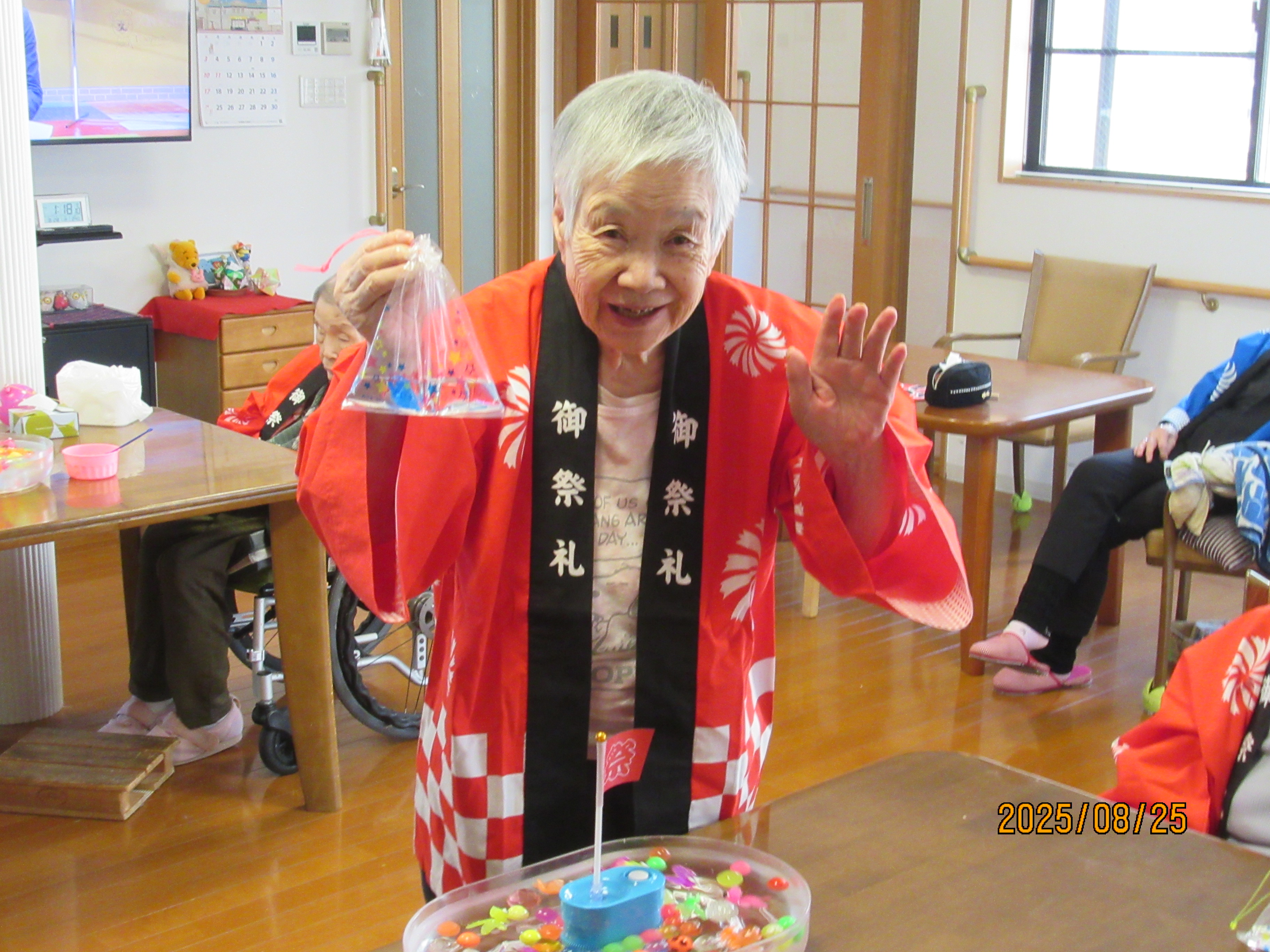 夏祭り part① (2F 風ユニット) 2025年9月12日 楽日荘スタッフ 2F 風 夏祭り開会宣言 ヨーヨー釣りに挑戦 一回で釣れる人もいれば、何回も挑戦する人も。 皆さん、釣れた時はとびきりの笑顔を見せてくれました アキ🦎