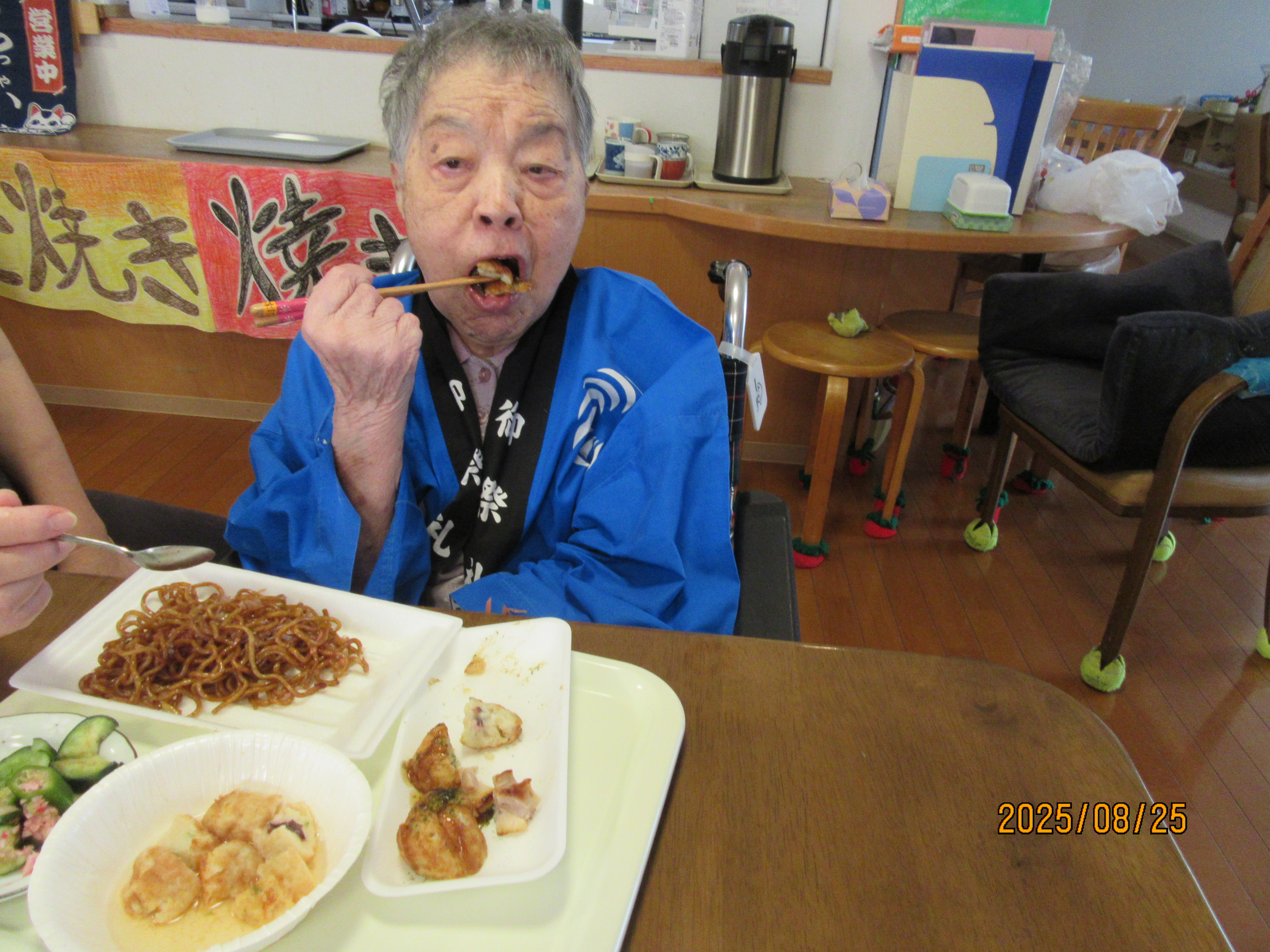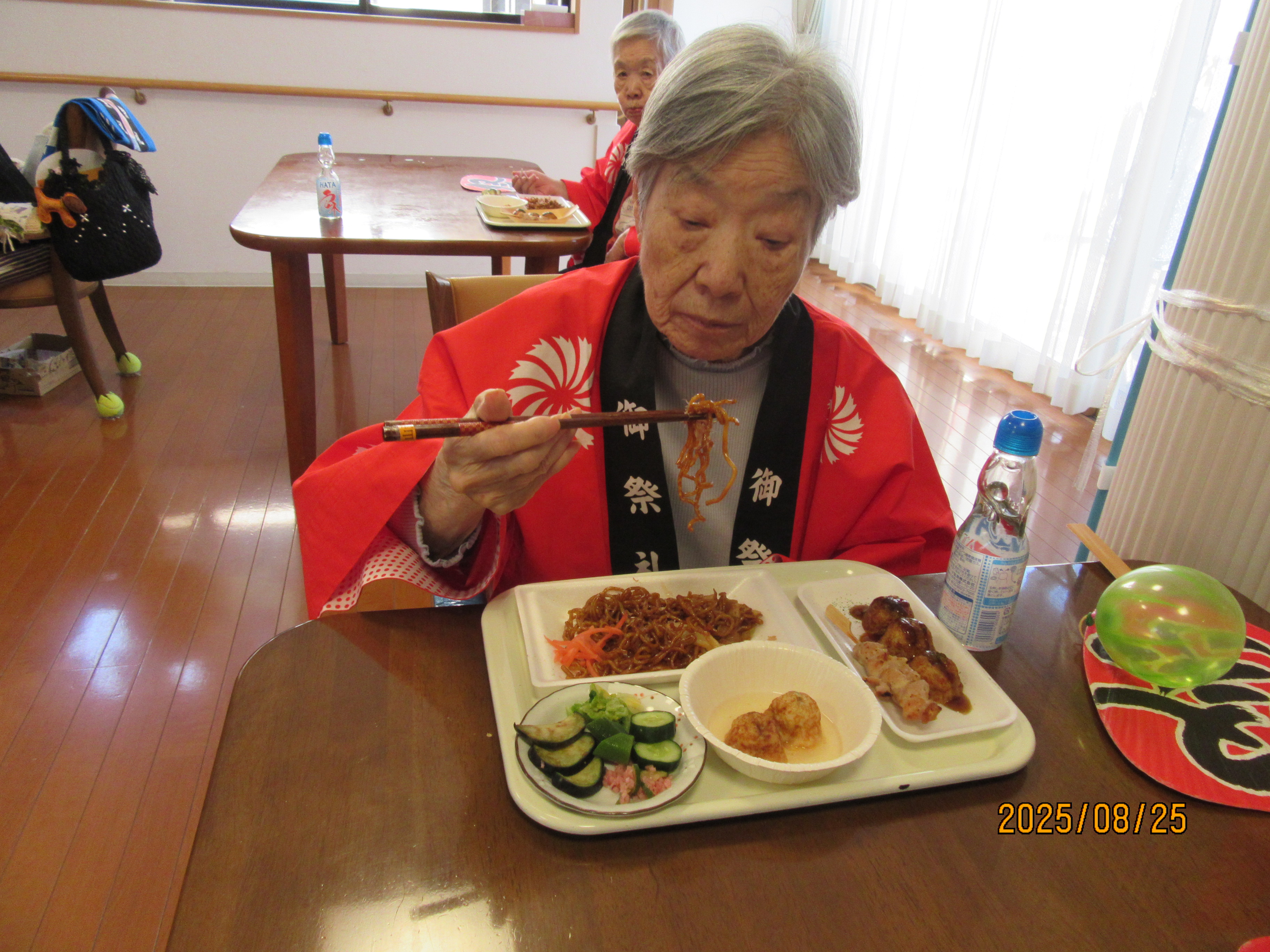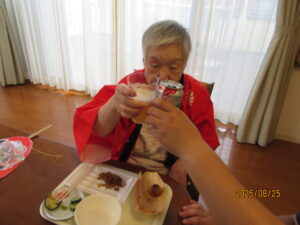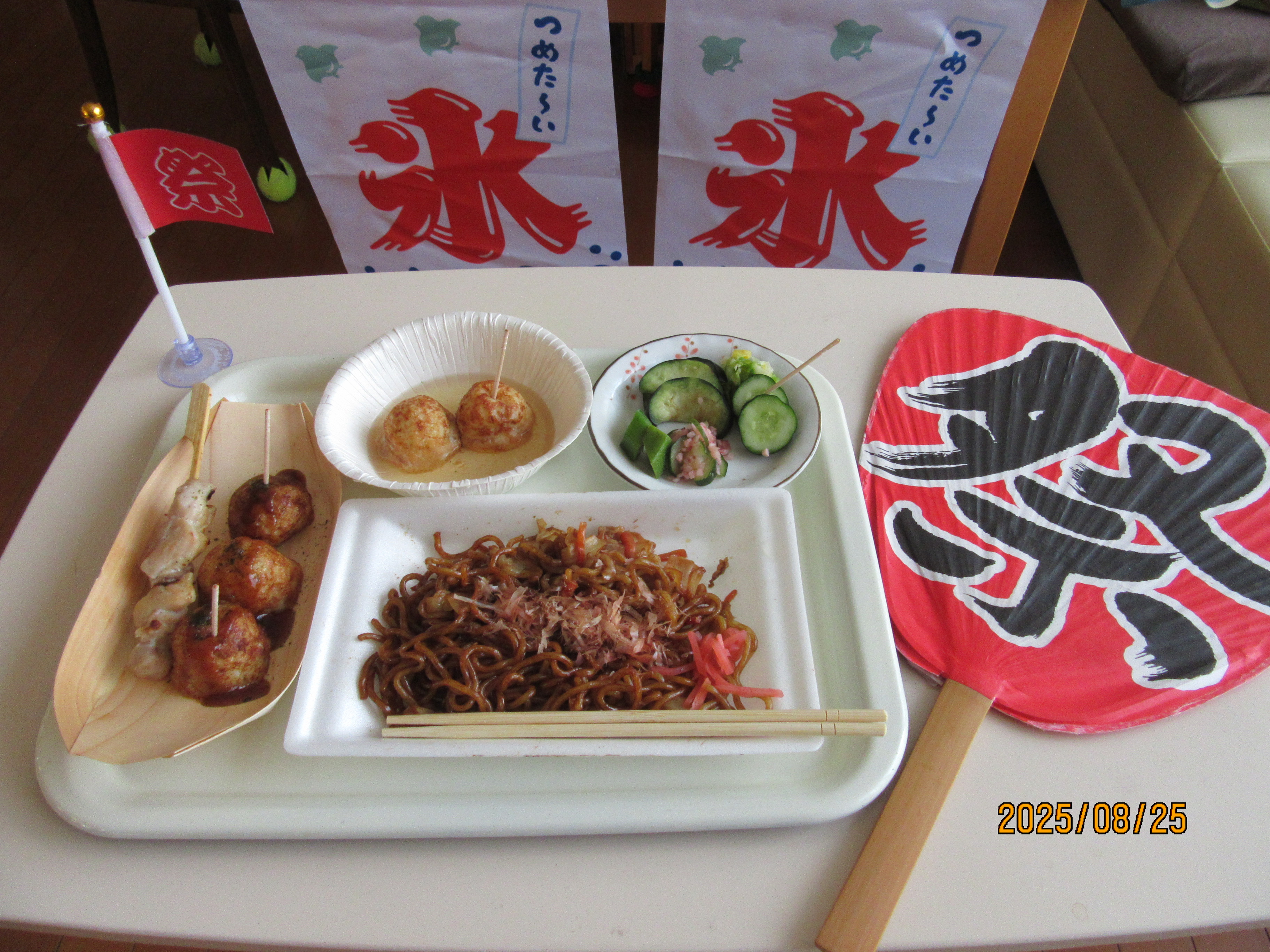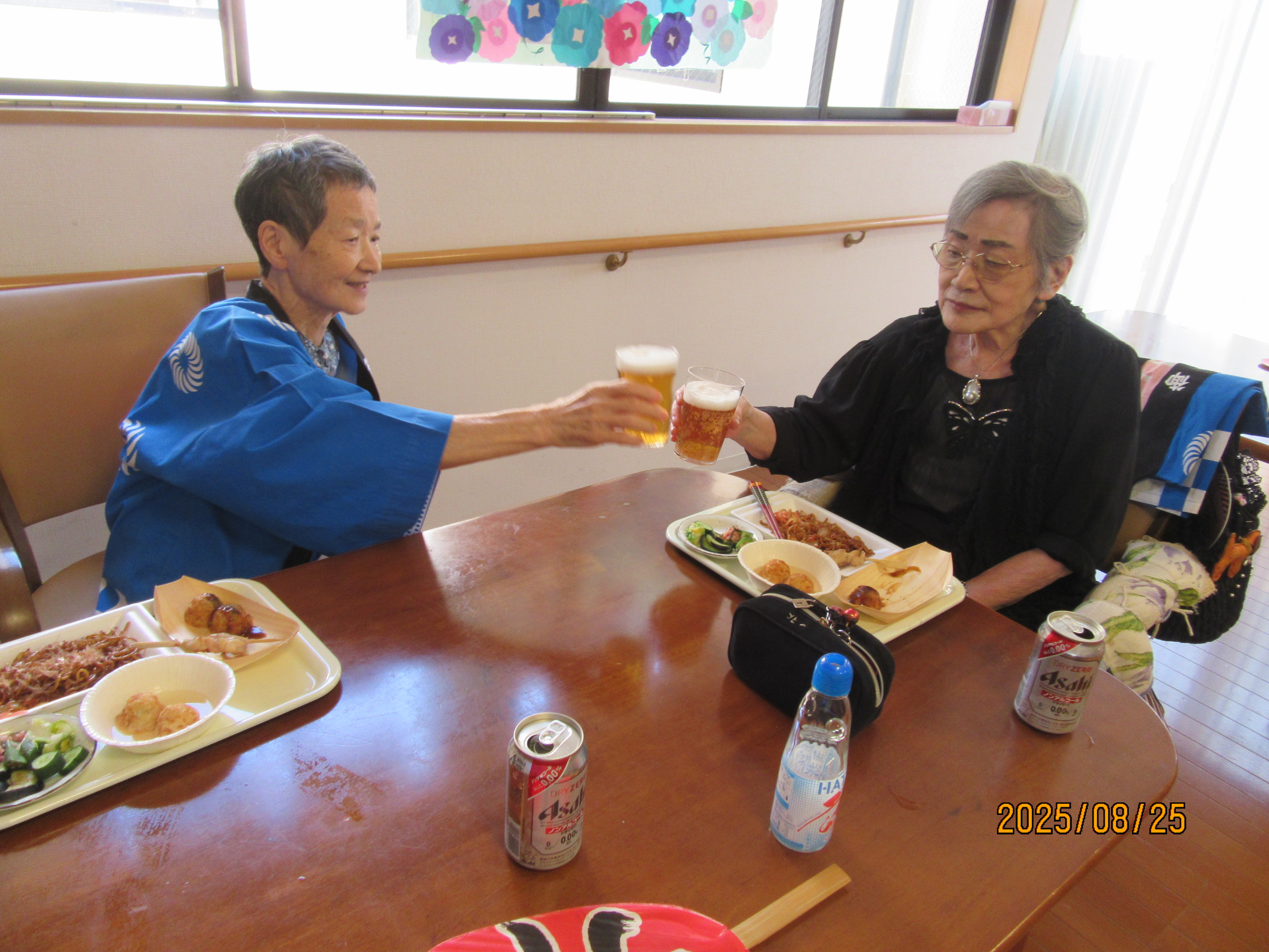 夏祭り part② (2F 風ユニット) 2025年9月12日 楽日荘スタッフ 2F 風 屋台風のお昼ご飯 ノンアルコールビールで乾杯🍻 いただきます ちょっと量が多いわ~と言われていましたが 皆さん、ぺろりと召し上がっておられました アキ🦎