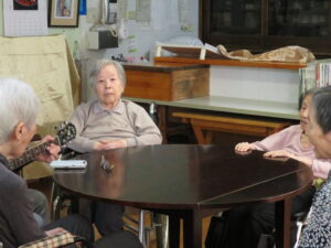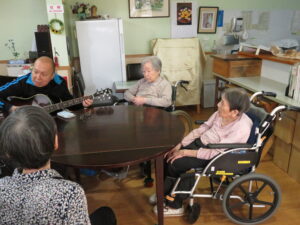 第1回 歌声喫茶 ふみちゃんサロン in スペース楽 2026年2月23日 楽日荘スタッフ ふれあいスペース楽, ボランティア, 1F 陽, 2F 風 こじんまりと始まりました、 歌声喫茶 ふみちゃんサロン in スペース楽です! 4名の利用者さんをお招きして、「ふるさと」や「七つの子」を歌いました♪ たぶんギターに触れたのが8年振りくらいで、いきなり本番にしましたが、 また不定期に開催するのでみんなで歌いましょうね♪ 歌ってるところを見かけたらどなたでもお気軽にご参加ください♪ ふみちゃん